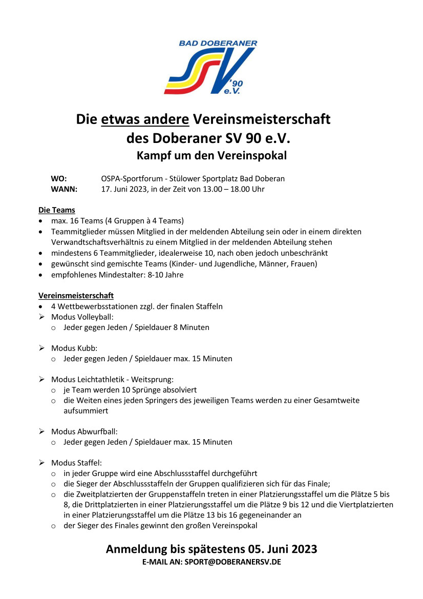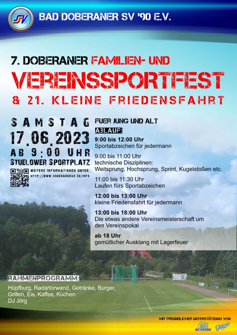Am 17. Juni 2023 findet das 7. Doberaner Familien- und Vereinssportfest unseres DSV auf dem Stülower Sportplatz statt.