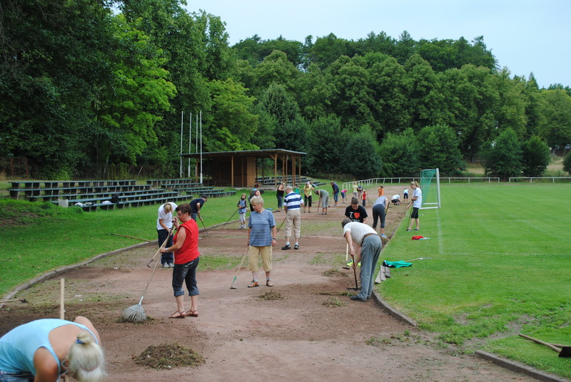 ... waren nicht nur die freiwilligen Helfer, die am Samstag, 10. August, morgens um 9 Uhr zum Arbeitseinsatz auf dem Stülower Weg angetreten waren. Halb fertig war auch gegen Mittag die Aschenbahn auf unserem Sportplatz im Stülower Weg, auf der ca. 40 DSV-Mit- und Nichtmitglieder bei (eigentlich) bestem Strandwetter mit Hacke und Harke im Einsatz waren. Getränke zum Erfrischen und Durchhalten standen bereit, für die nötige Lockerheit sorgten die Männer, Frauen und Kinder selbst. Als um 12 Uhr die Mittagsglocke läutete, waren ca. 200 Meter Aschenbahn vom Unkraut befreit, der Hang gemäht und die Zuschauertribüne repariert. Ein bisschen Arbeit wartet noch auf die Nachhut. Vielleicht diesmal mit ein paar mehr Leuten - getreu dem Motto: Viele Hände, schnelles Ende.